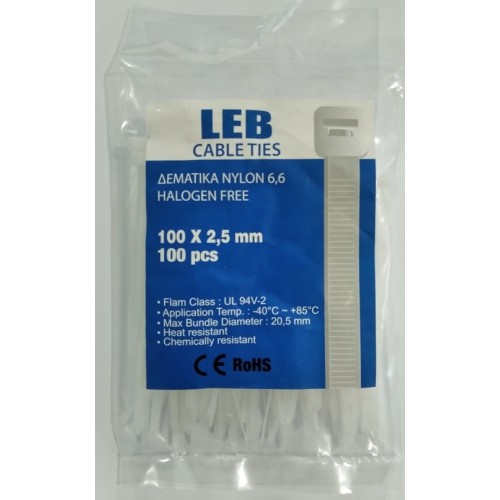 ΔΕΜΑΤΙΚΟ ΛΕΥΚΟ 2,5Χ100 ΚΩΔΙΚΟΣ : 3737025100 ΣΥΣΚΕΥΑΣΙΑ : 100 ΤΜΧ Nylon 6,6 Halogen Free Flam Class : UL 94V-2 Application Temp. : -40oC ... +85oC Heat Resistant Chemically Resistant Η τιμή αναφέρεται σε ένα τεμάχιο...
